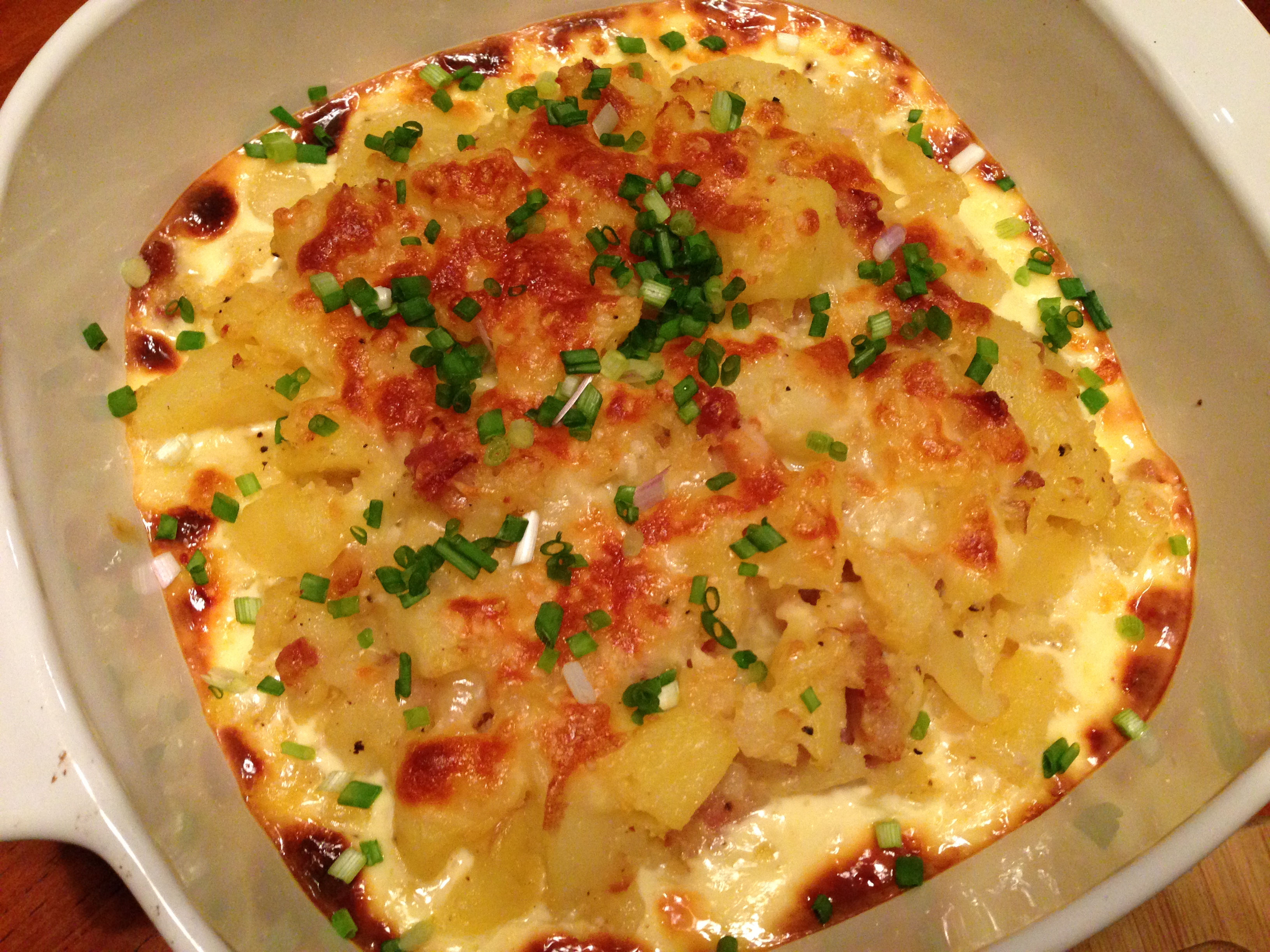 potatoes, then mash and season it while it’s still warm, in fact I can add brown butter, shallots, bacon bits and cheddar into the mash. Better still, put the mash in a pool of cream & cheese, so that it forms a cheesy custard when grilled.
