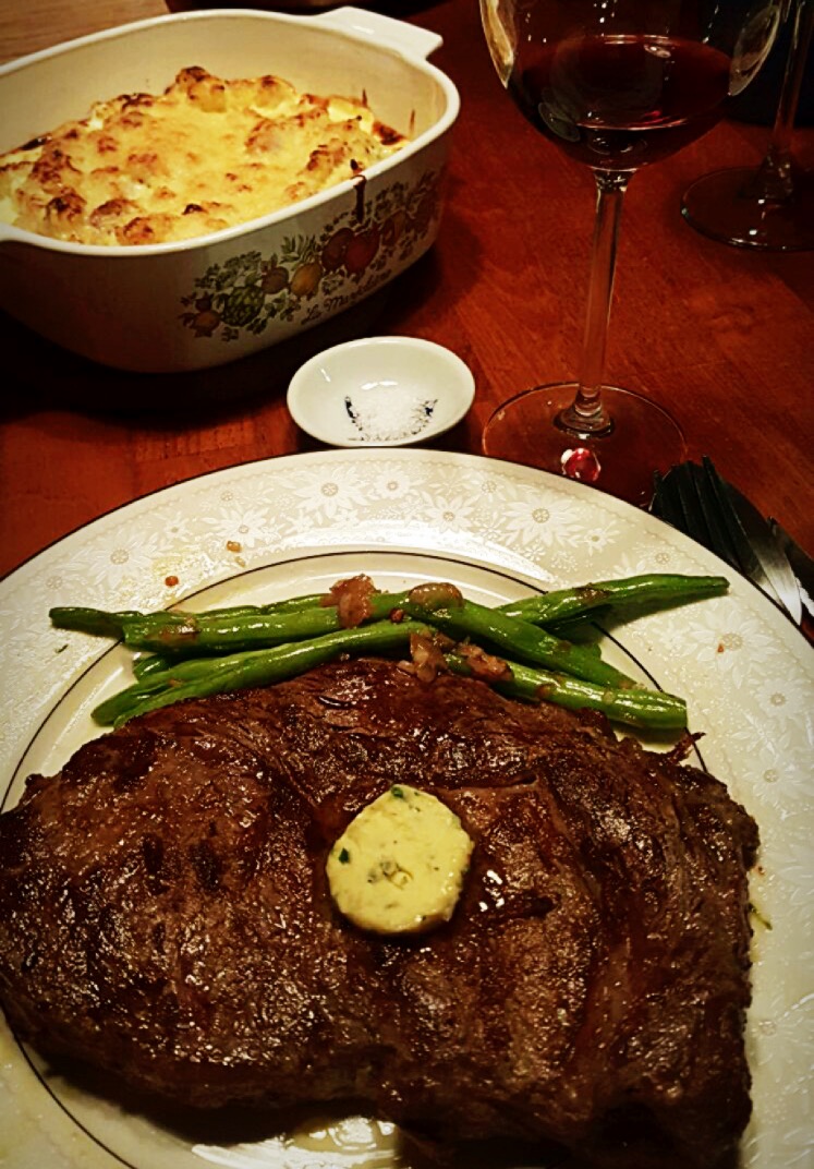 - Some greens…maybe beans! Par-boiled then fried with butter in the same pan as the bacon yumzz. Plated with the steak for a less guilty pleasure!