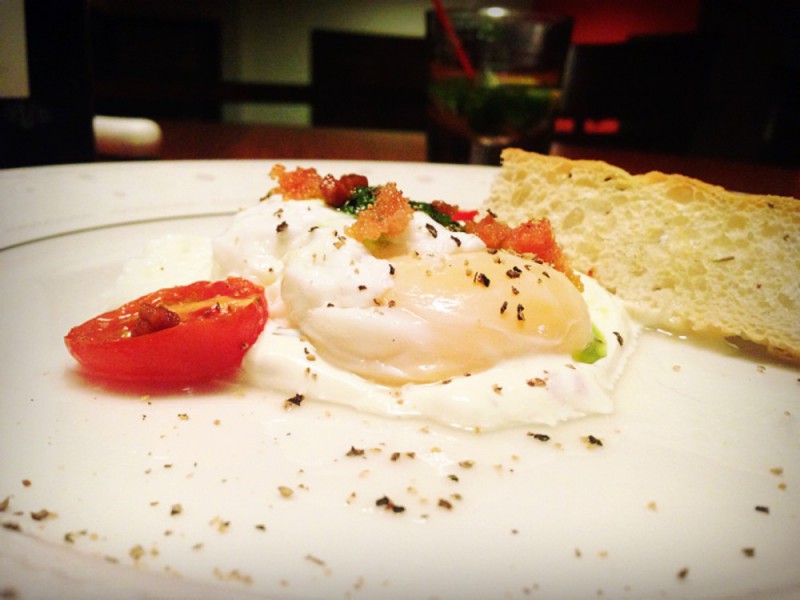 - For starters, I was inspired by a recipe I saw on a cooking show. It had a dollop of yoghurt on which to rest the poached egg. I’m thinking of cream cheese, shallots and fresh tarragon to add to the yoghurt! Poached egg on top, decorated with fried cubes of cured lard, home-made pesto (easy to make ahead from fresh herbs in mom’s garden), mentaiko in my freezer!